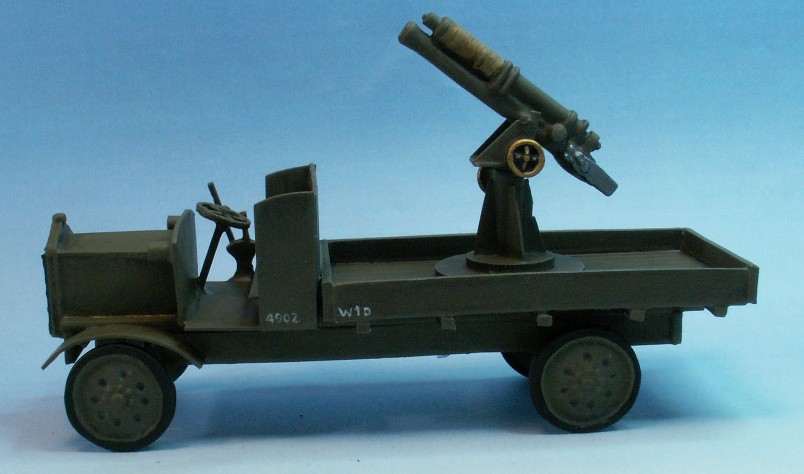 The original plan was to take a Sloppy Jalopy 1916 Thornycroft flat-bed truck and have it carry a scratch built 13pdr 9cwt gun on a pedestal mounting. The Sloppy Jalopy model is big and very heavy being cast entirely of white metal. When it was built I found that I had used so much superglue that I had stuck myself to my chair. The completed model did not fit together well and needed at lot of filler so I placed it to one side and reached for the plasticard and I scratchbuilt a generic WW1 truck based on Ken Musgrave's scale drawing of a Daimler. I scaled the image to approximately 1/56 and to my delight found that the wheels on the plan were the same diameter as the Thornycroft front wheels. I press moulded half a dozen greenstuff wheels from the white metal original. The barrel of the gun is a Great War Miniatures 13pdr from the bits box.The steering wheel, the break and gear stick are from the Sloppy Jalopy kit. Everything else is scratched. I just need a couple of Tommies to act as crew.